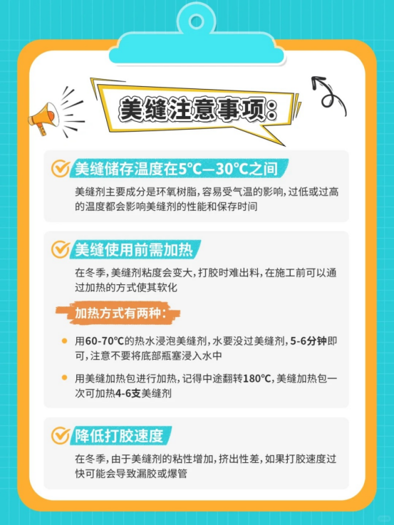 在冬季,美缝剂粘度会变大,打胶时难出料,在施工前可以通过加热的方式使其软化